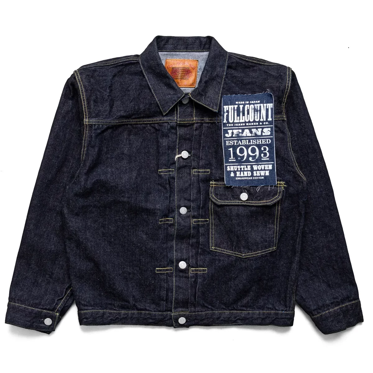 - Leather label; selvedge inside front placket.