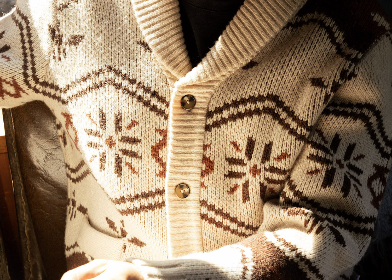 The Wincha Shawl Collar Sweater captures that perfectly. With its thick wool blend, oversized buttons, and relaxed fit, it feels equal parts heritage and weekend escape. The pattern—drawn from traditional Wincha headbands—adds texture and personality, while the shawl collar gives it a timeless, almost cinematic quality.